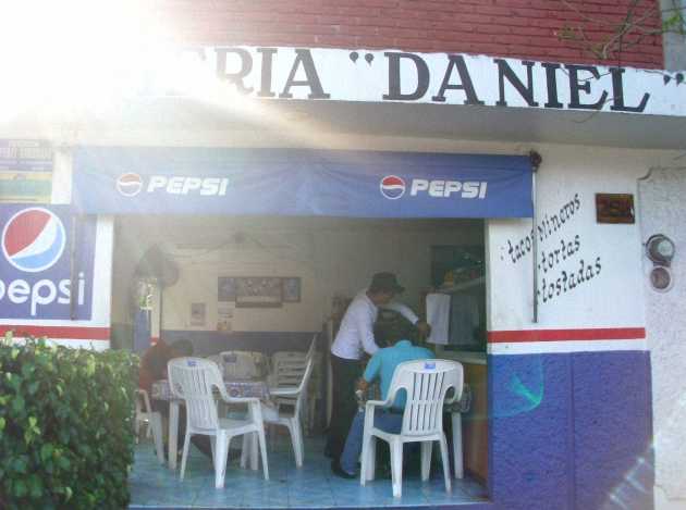 Atendida por su propietario, «Lonchería Daniel» se distingue, principalmente, por dos cosas: paridad entre sabor-precio y atención al cliente. Si bien, el único mesero es Elías (en la fotografía usa gorra) y te parecerá insuficiente dada la concurrencia, no necesitarás decirle dos veces lo que deseas ordenar. Con una capacidad de retención envidiable, pueden pasar 15 minutos para que Elías pase tu orden sin olvidar que has pedido los tacos sin cebolla y jalapeño. Cabe apuntar que Elías no echa mano de libreta alguna: la herramienta es su cuerpo, que se desliza sobre un reducido perímetro como sólo he visto hacerlo a Micheal Jackson en «Rock my world».